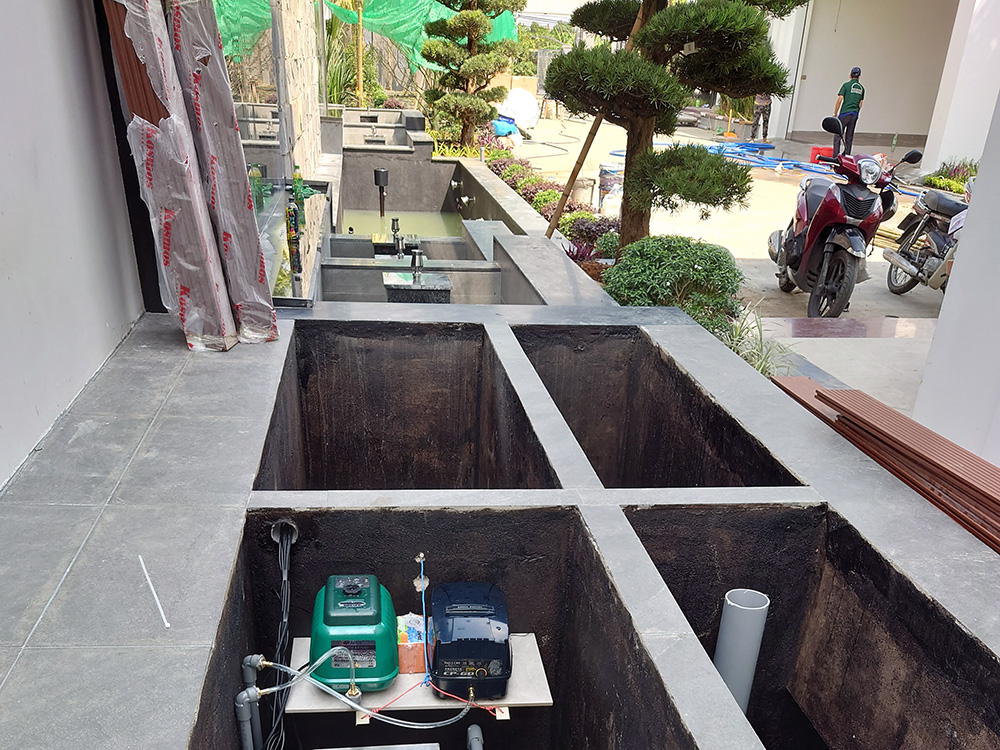 - Hồ koi hiện trạng: Thể tích bể hồ và bể lọc 20m3 (Thiết kế thi công mới)